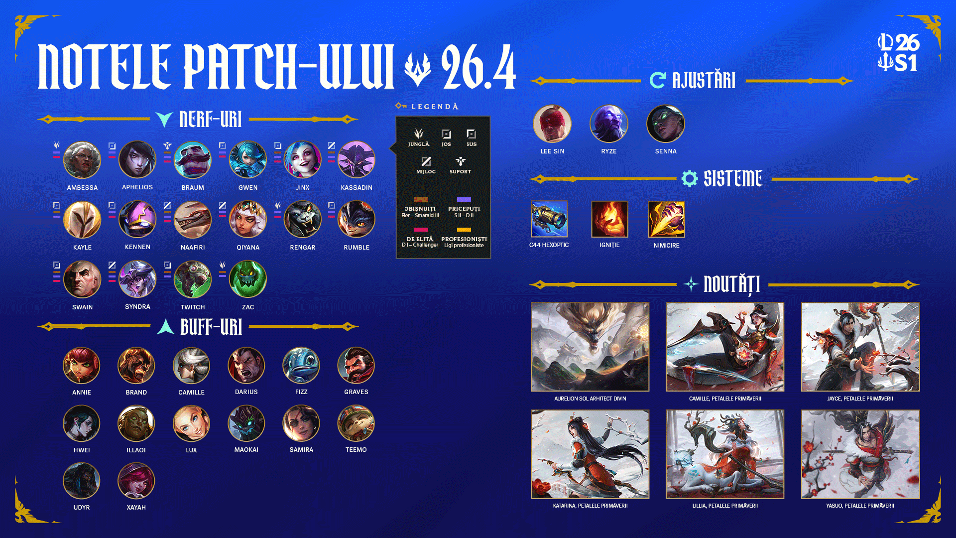Avem pentru tine un alt patch de echilibrare mai mare decât de obicei, în timp ce continuăm să analizăm campionii care ies în evidență sau care nu prea sunt iubiți în noul sezon. Deși majoritatea modificărilor noastre sunt destul de standard, ne-am uitat și la junglerii care au fost populari în trecut, dar care au alte roluri principale, și am încercat să-i aducem într-o stare echilibrată.