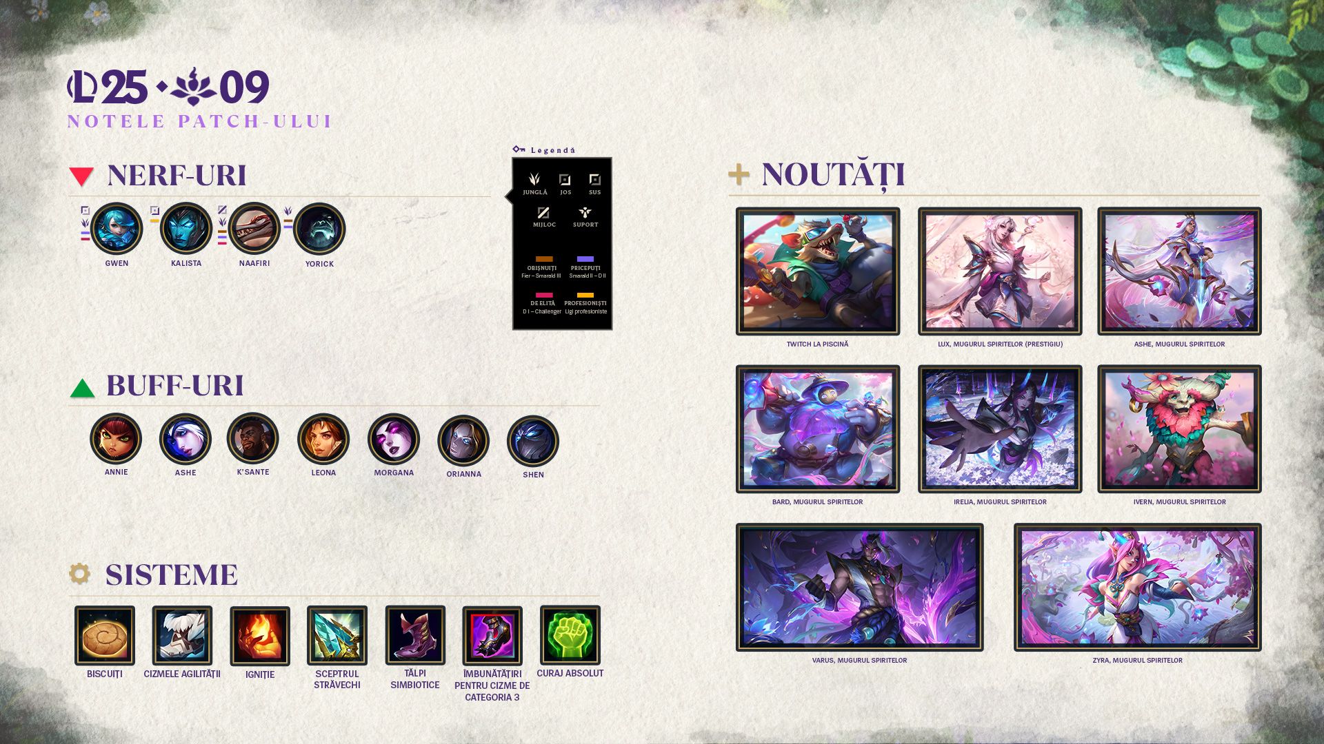Avem câteva modificări mai mari în acest patch, precum o nouă hartă Mugurii spiritelor, Atakhan legat cu spini, modificări ale obiectivelor din Vid, îmbunătățirea detectării morților intenționate subtile, un nou lot de skin-uri Mugurii spiritelor, un nou permis de luptă și multe altele!