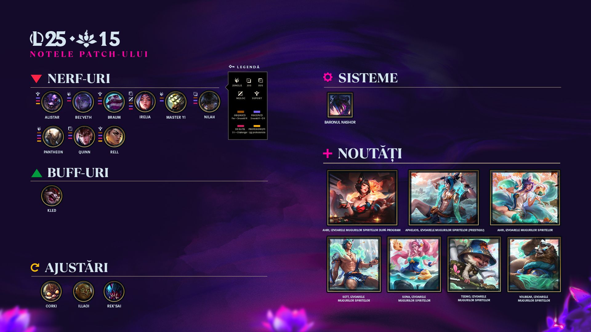 E timpul să intrați în atmosfera izvoarelor termale și să citiți ce v-am pregătit în patch-ul 25.15! În acest patch, avem modificările obișnuite de echilibrare pentru Riftul Invocatorului, ARAM, plus o serie de eliminări de bug-uri! De asemenea, avem o funcție numită ''previzualizările abilităților campionilor'', care vă permite să aruncați o privire peste seturile campionilor înainte și după ce îi alegeți, ca să le recapitulați, dacă n-ați mai jucat de ceva timp cu ei. Încercați-o și spuneți-ne ce părere aveți!