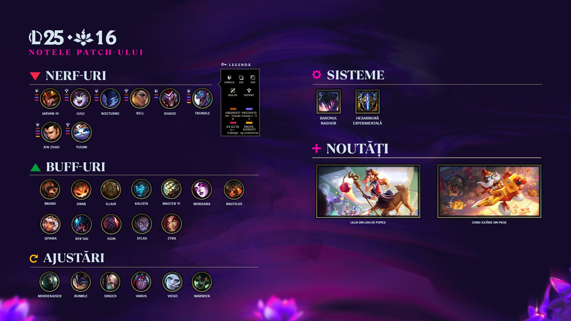 Acesta este ultimul patch din etapa ranked a sezonului 2, deci, dacă vreți să puneți mâna pe Fiora victorioasă, nu uitați să vă atingeți obiectivele ranked în acest patch! În altă ordine de idei, în acest patch urmează să înceapă turneul Clash ARAM, deci pregătiți-vă echipele de 5 jucători. Avem și două skin-uri diverse care sosesc zburând sau rostogolindu-se în acțiune în acest patch, deci aruncați-le o privire lui Corki jucărie din piese și Lillia din liga de popice! Ne vedem în Rift!