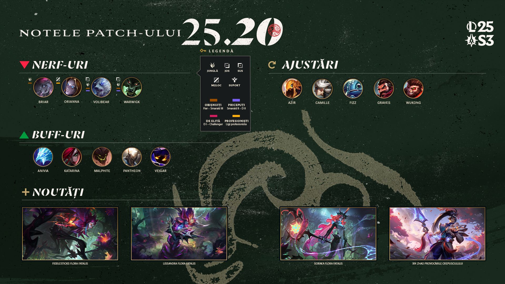Bun-venit la patch-ul oficial al Campionatului Mondial de League of Legends 2025! Cum majoritatea schimbărilor orientate către profesioniști au venit în patch-ul anterior, acordăm o atenție deosebită ca modificările de acum să fie potrivite atât pentru jucătorii profesioniști, cât și pentru noi ceilalți de acasă. Drept urmare, aducem câteva buff-uri pentru campionii care au performanțe mai slabe în comparație cu alți campioni în mâinile jucătorilor experimentați, câteva nerf-uri pentru cei care domină constant la niveluri mai mici de îndemânare și o serie de ajustări menite să crească sau să reducă puterea pe scena profesionistă, fără să afecteze procentajul general al victoriilor în modurile normale și ranked.