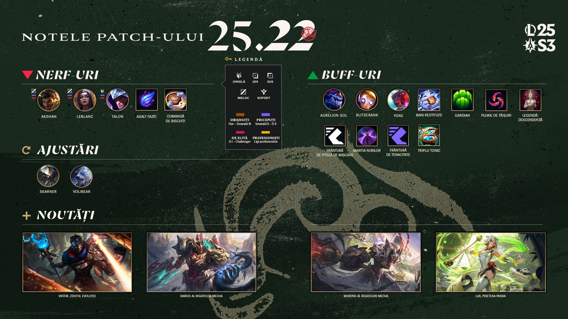 Atenție, jucători de Viktor! Viktor, zenitul evoluției va fi lansat în acest patch, după câteva ajustări care să-l aducă mai aproape de ceea ce mulți dintre voi ne-ați cerut. Îl vom oferi gratuit pentru toți iubitorii de Viktor, dacă ați avut cel puțin nivelul 5 de măiestrie la data de 4 august 2025. Dacă nu sunteți jucători de Viktor, nu e niciodată prea târziu să vă alăturați evoluției glorioase. Îl puteți cumpăra pe Viktor, zenitul evoluției din magazin începând de mâine.