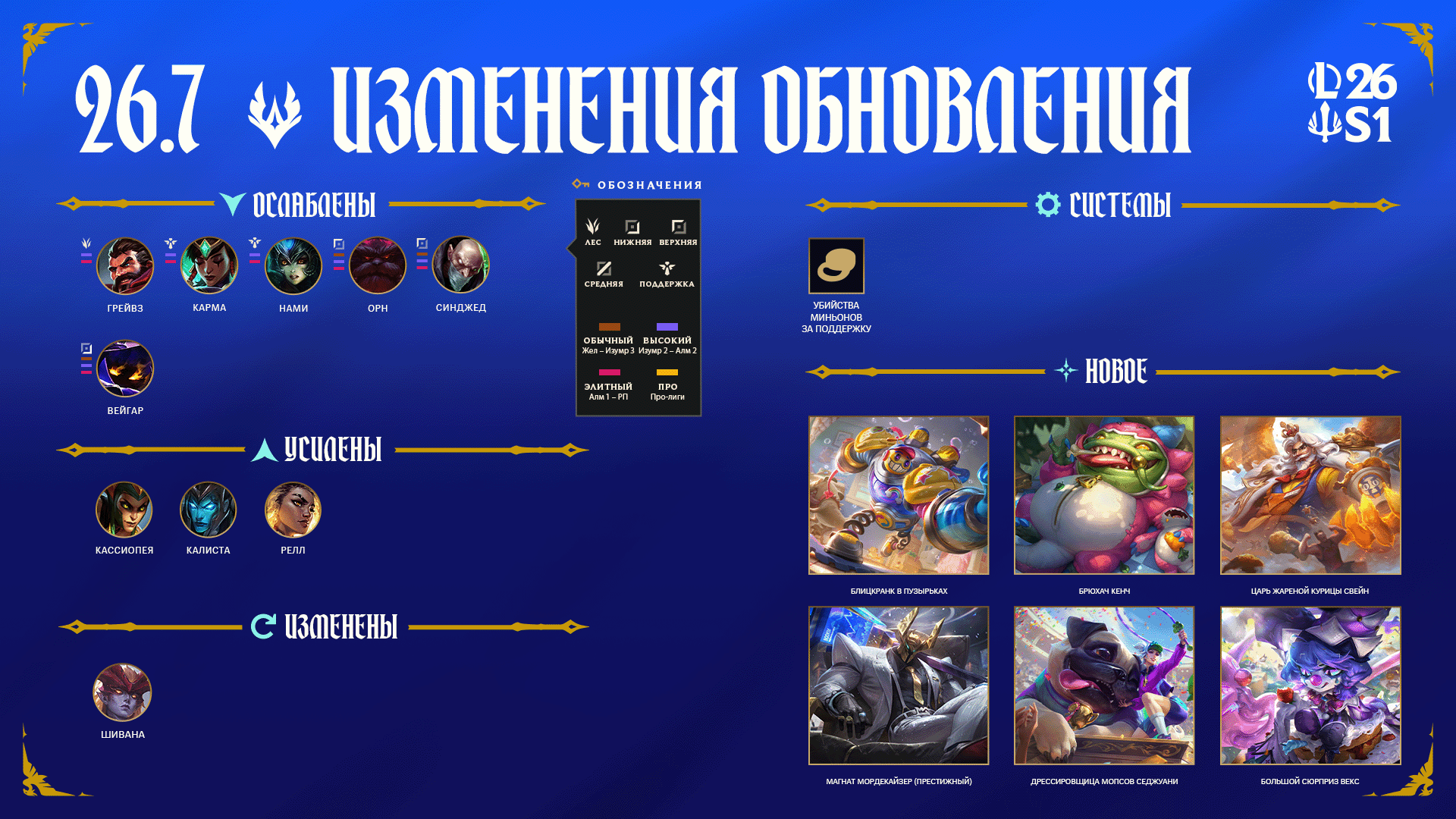 В этом обновлении вас ждет не так много изменений – мы сосредоточились на подготовке к переходу во второй сезон, который начнется в следующем месяце. Ряд изменений затронет чемпионов поддержки – Нами и Карма сейчас доминируют в матчах на высоком уровне, а вот Релл почти никто не выбирает. Также мы ослабим нескольких чемпионов, которые стали чрезмерно эффективными.