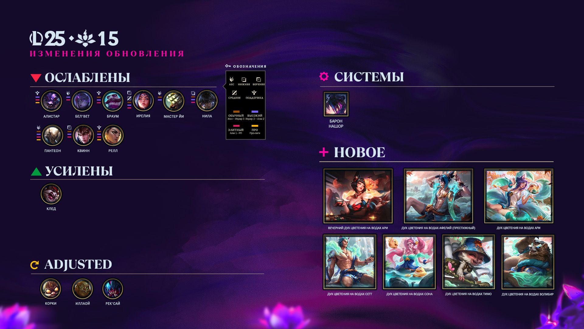 Насладитесь атмосферой горячих источников и почитайте, что интересного появится в обновлении 25.15! Вас ждут изменения баланса в Ущелье призывателей и ARAM и исправления ошибок! Кроме того, мы добавили функцию просмотра умений – благодаря ей можно будет просматривать умения чемпионов до и после того, как вы определитесь с выбором. Если вы давно за кого-то не играли, она точно пригодится. Опробуйте ее и поделитесь своими отзывами!