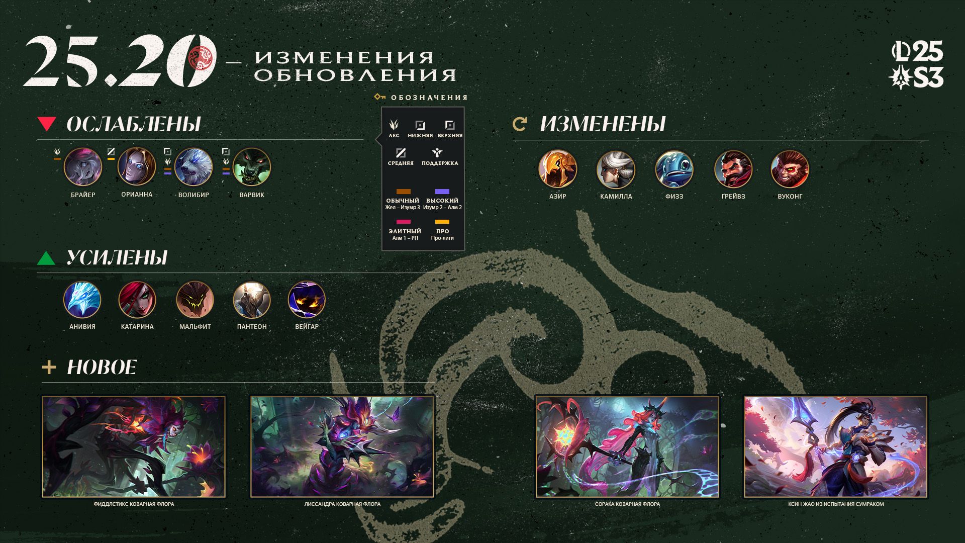 Встречайте обновление, которое посвящено Чемпионату мира 2025 по League of Legends! В предыдущем обновлении большая часть изменений затрагивала профи, так что в этом обновлении мы хотим порадовать не только их, но и всех игроков в целом. Мы усилим чемпионов, которые проявляют себя посредственно, даже когда за них играют опытные игроки, и ослабим тех, кто слишком силен на низких рангах. Кроме того, мы внесем ряд изменений, которые преимущественно повлияют на профессиональных игроков, не слишком сильно затрагивая частоту побед соответствующих чемпионов в обычных и ранговых играх.