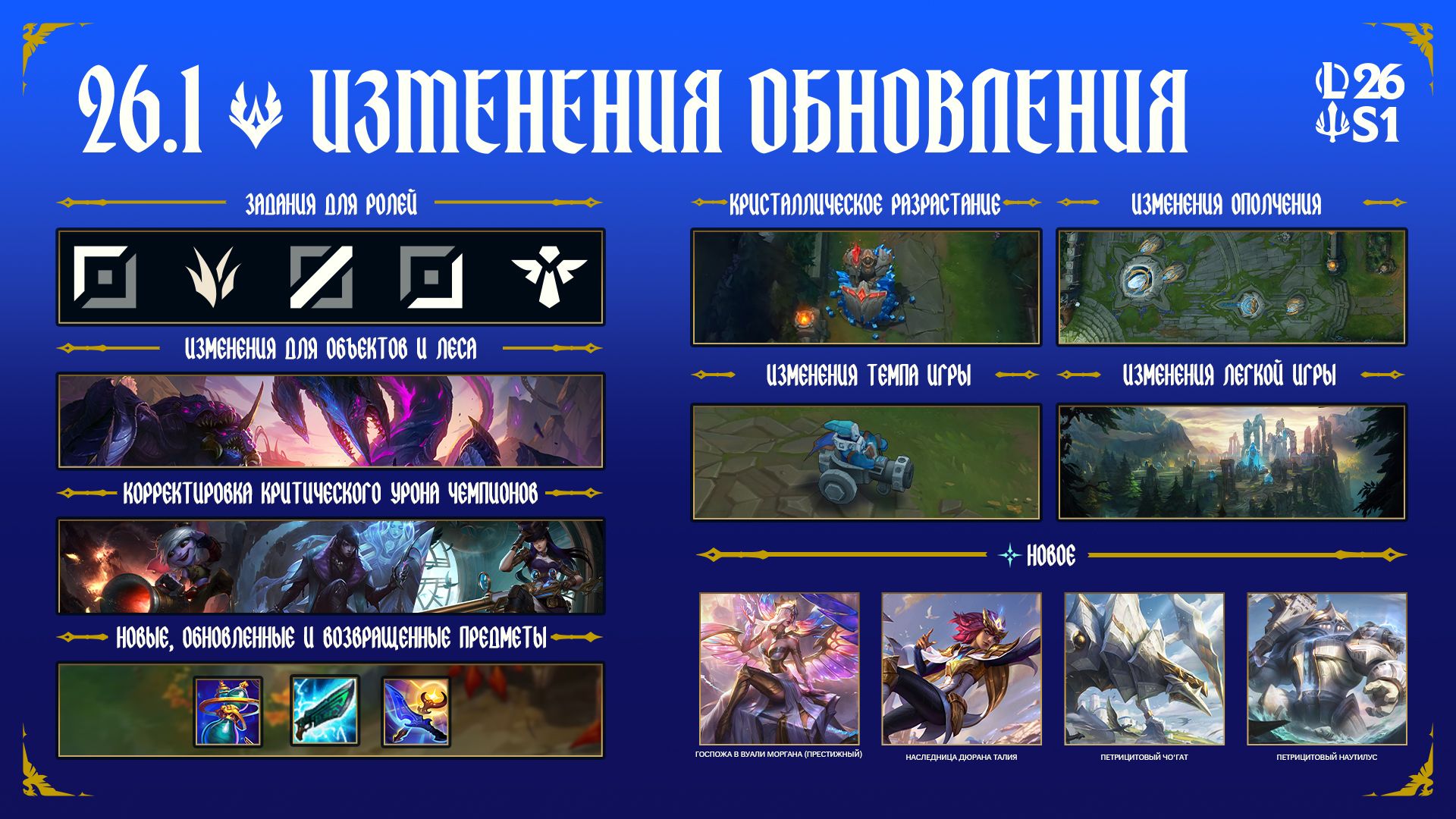 Встречайте новый сезон League of Legends! В этом обновлении вас ждет огромное множество существенных изменений – если не хотите читать несколько тысяч слов, ознакомьтесь с их кратким описанием в этом разделе. На стратегическом уровне приоритеты сместятся от битв за эпических монстров к уничтожению башен – мы внесем ряд соответствующих изменений и добавим механику кристаллического разрастания. Мы изменим баланс ролей в матче и добавим задания для каждой роли. С особыми участками в игре появятся новые механики обзора. Новые предметы для каждого класса с нетерпением ждут возможности попасть в ваш инвентарь, а базовый критический урон теперь будет составлять 200%. Благодаря ряду изменений, которые коснутся ранговой очереди, автозаполнение станет не такой суровой участью. Кроме того, матчи начнут проходить быстрее – как в обычном Ущелье призывателей, так и в легкой игре. С подробностями этих изменений можно ознакомиться в статье разработчиков здесь. Или просто читайте дальше!