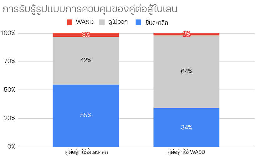 เราส่งแบบสำรวจเหล่านี้ไปให้ผู้เล่นหลังจบเกม โดยเป็นเกมที่ใช้การควบคุมทั้งสองรูปแบบ ในทุกคิวที่เปิดใช้งานการควบคุม WASD เราพบว่าแทบไม่มีผลกระทบต่อประสบการณ์การเล่นเกมเลย พูดง่าย ๆ คือ ผู้เล่นโดยทั่วไปบอกไม่ได้ว่าคู่ต่อสู้ใช้การควบคุมรูปแบบใด