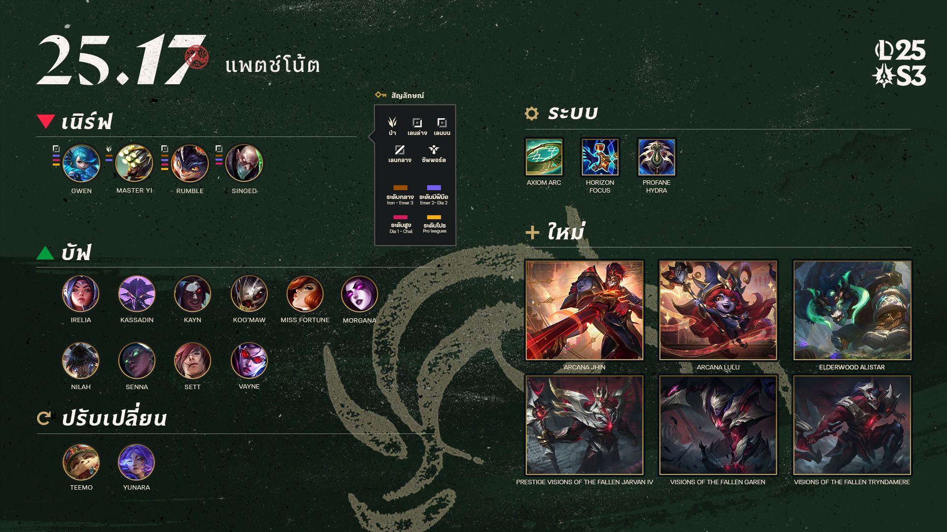 นอกจากนี้ เราได้ถอดสกินของเขาออกจากคลังจนถึงแพตช์ 25.18 นี้ หากคุณยังไม่มีสกินไหน ก็ได้เวลาจับจองตลอดสองแพตช์นี้แล้ว