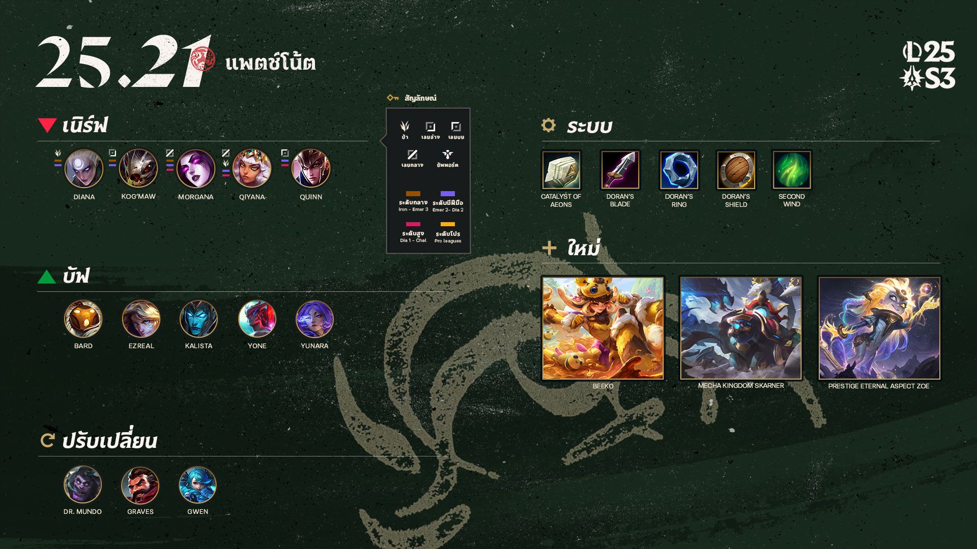 เราจะปล่อยพาสประจำซีซั่นพาสสุดท้ายของปีนี้ในแพตช์ 25.21! อย่าลืมทำเควสให้เสร็จสิ้นเพื่อเป็นเจ้าของสกินอย่าง Beeko, Mecha Kingdoms Skarner และ Prestige Eternal Aspect Zoe พร้อมด้วยอีโมต ไอคอน และไอเทมอื่น ๆ ทั้งหมดที่เรามีในพาสนี้กันด้วยนะ