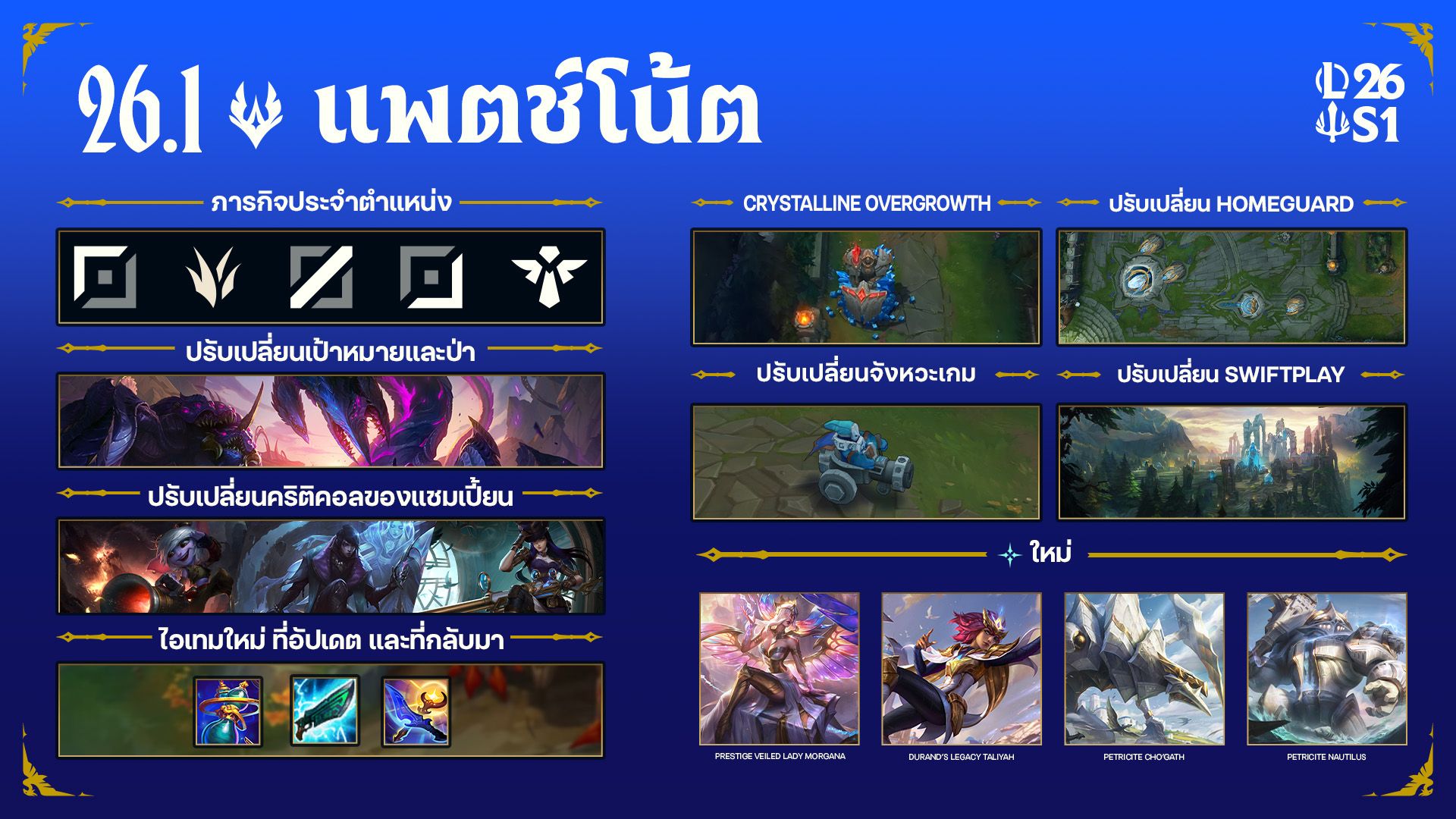 ขอต้อนรับเข้าสู่ซีซั่นใหม่ล่าสุดของ League of Legends! เรามีการเปลี่ยนแปลงครั้งใหญ่มากมายในแพตช์นี้ และถ้าคุณไม่อยากอ่านเนื้อหายาวเหยียดเป็นพัน ๆ คำแล้วล่ะก็ นี่คือภาพรวมที่จะเกิดขึ้นแบบย่อ ๆ โดยกลยุทธ์ด้านเกมเพลย์จะขยับไปที่เรื่องของการดันป้อมให้มากขึ้น และปรับลดเรื่องการแย่งชิงมอนสเตอร์ในตำนานลงพร้อมด้วยการปรับแก้บางส่วน ตามด้วยการมาถึงของระบบใหม่อย่าง Crystalline Overgrowth นอกจากนี้เรายังจะปรับสมดุลเรื่องพลังตำแหน่งกันใหม่ด้วยการมาของระบบเควสตามตำแหน่งโฉมใหม่ กลไกวิสัยทัศน์ใหม่ที่กำลังรอคุณให้ได้เรียนรู้และใช้งาน Faelight จนชำนาญ ไอเทมใหม่ของแต่ละคลาสที่กำลังรอคอยเพื่อจับจองพื้นที่ในช่องไอเทมของคุณ ตามด้วยการเปลี่ยนแปลงความเสียหายคริติคอลพื้นฐานที่ตอนนี้จะอยู่ที่ 200% อีกด้วย ในส่วนของเกมจัดอันดับเองก็จะมีการเปลี่ยนแปลงใหม่เพื่อบรรเทาความเซ็งจากการที่ต้องเล่นตำแหน่งเติมอัตโนมัติกันอีกด้วย แถมตัวเกมก็จะเร็วขึ้นอีกเล็กน้อยทั้งในโหมด SR ตามปกติและ Swiftplay หากคุณต้องการเรียนรู้เพิ่มเติมเกี่ยวกับการเปลี่ยนแปลงเหล่านี้แล้วล่ะก็ เข้าไปดูที่บล็อกผู้พัฒนาที่นี่ หรืออ่านต่อได้เลย!