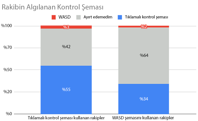 Bu anketleri, her iki kontrol şemasının da kullanıldığı oyunların ardından paylaştık. WASD kontrol şemasının etkin olduğu tüm sıralarda oyun deneyimi üzerinde neredeyse hiçbir fark olmadığını gördük. Oyuncular genellikle rakiplerinin hangi kontrol şemasını kullandığını ayırt edemiyordu.