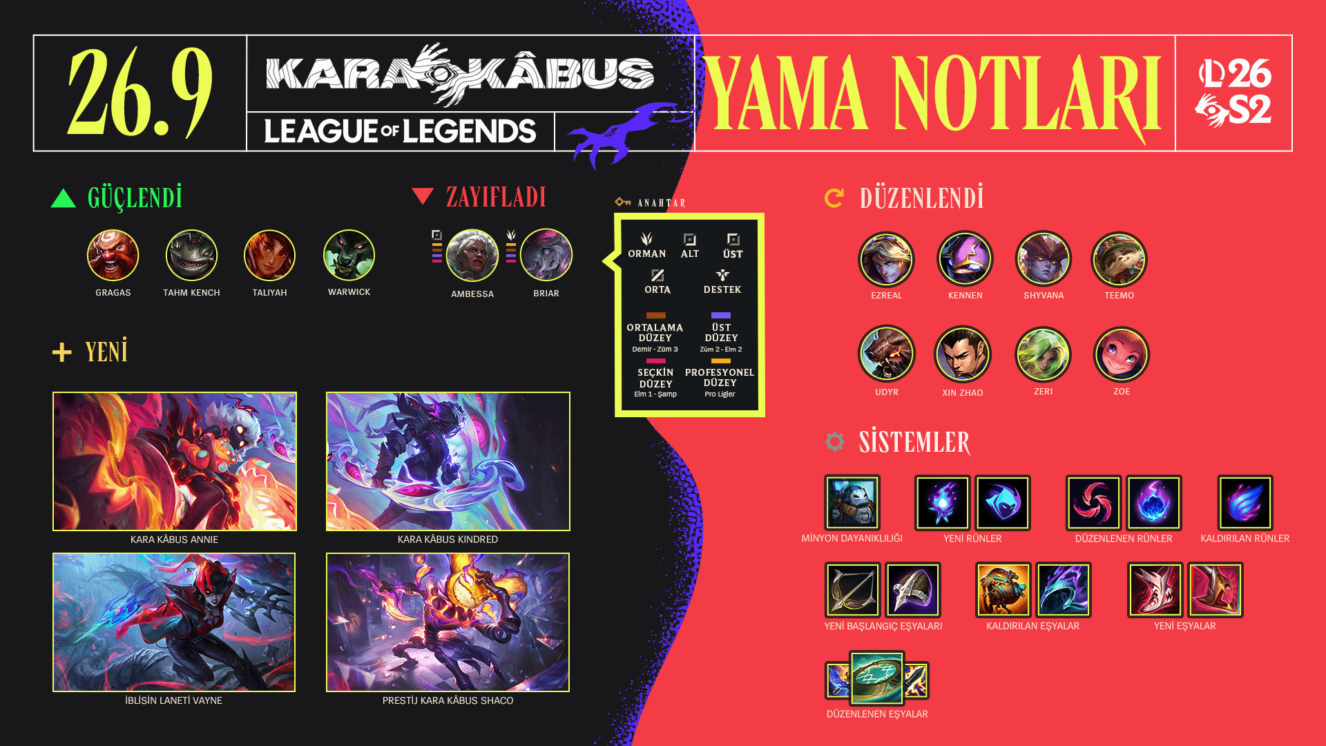 Bu yamada şampiyonlara, eşyalara, sistemlere ve rünlere dair bolca güncellememiz var. Bu kapsamda Ölümateşi Dokunuşu ve Yıldırım Yağmacısı'nın Cinneti gibi çok sevilen eski eşyaları geri getiriyoruz ve yeni başlangıç eşyaları ile çeşitli alternatif şampiyon dizilimleriyle deneyebileceğiniz bir sürü yeni seçenek sunuyoruz. Rol hedeflerine ise birkaç denge değişikliği ile düzenleme getirerek ilerlemeyi basitleştiriyoruz ve orta koridorun hedef ödülüne rolün zamanla artan güç kimliğine uyacak küçük bir yenileme getiriyoruz. Son olarak Shyvana'ya ilgi göstererek SG ve YG dizilimlerini farklılaştırıyoruz ve dayanıklı bir ejderha olması için yollar sunuyoruz.