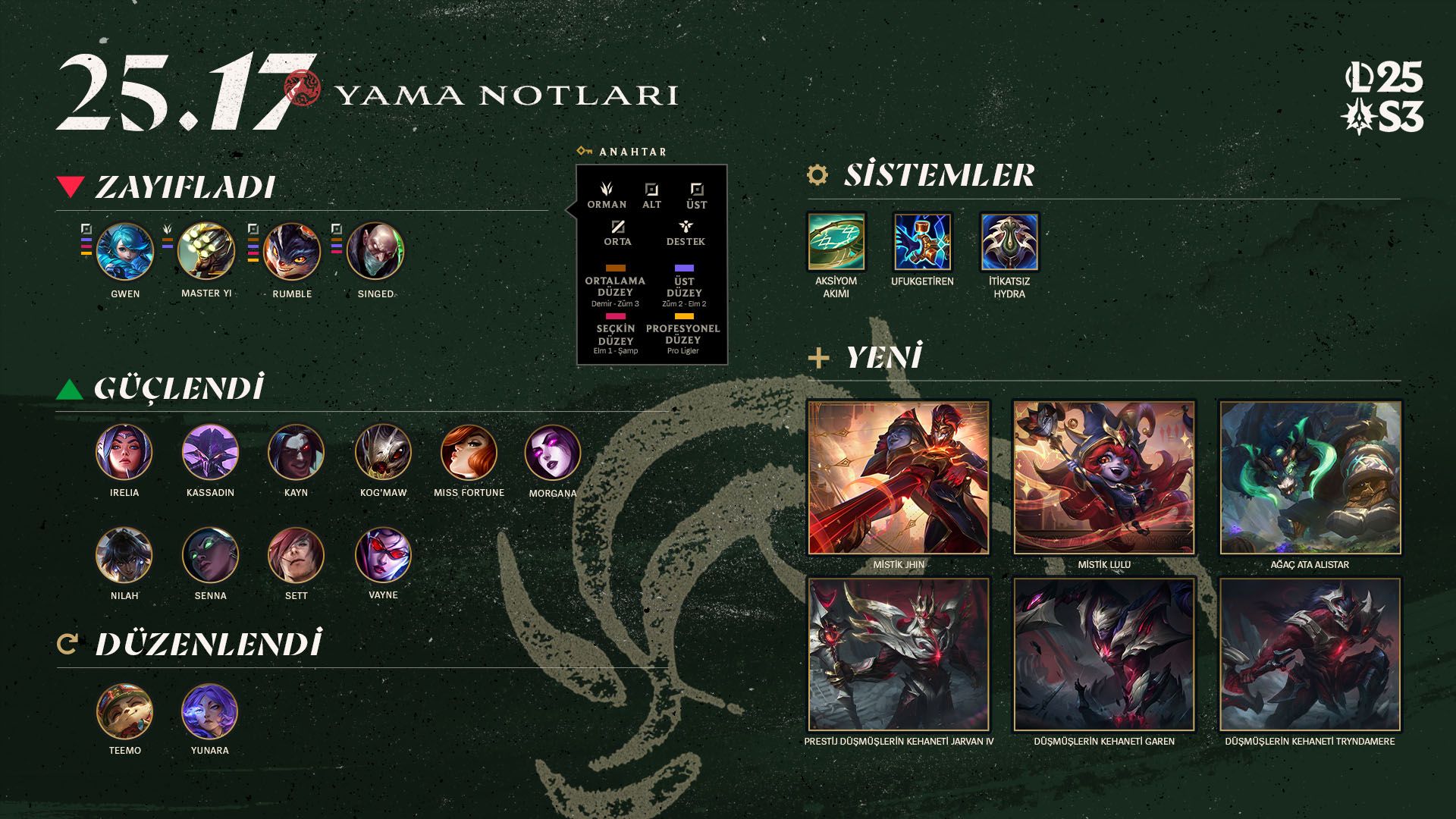 3. Sezon'a hoş geldiniz! Bu yamada oyunun birçok alanında bolca yenilik var. 3. Sezon'la beraber klasik Sihirdar Vadisi haritası dönüyor, Felaket Botları tekrardan aramıza katılıyor, Xin Zhao büyük bir görsel güncelleme alıyor, yeni sezon kartı ekleniyor, orman sayaçları gibi oyun takibi sistemlerine iyileştirmeler geliyor ve bir dolu yaşam kalitesi iyileştirmesi ile hata düzeltmesi sizi bekliyor. Ayrıca ARAM için denge değişiklikleri ve Arena şöhret yoluna da sıfırlama getiriyoruz!