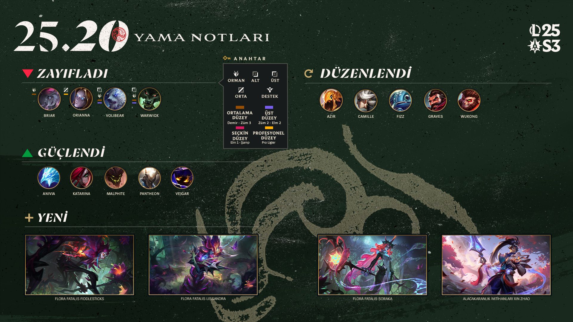 2025 League of Legends Dünya Şampiyonası'nın resmi yamasına hoş geldiniz! Profesyonel sahneye yönelik değişikliklerimizin çoğunu geçen yamada getirdiğimiz için bu yamadaki değişikliklerin hem profesyonel hem de bizim gibi oyunu evinden oynayan oyunculara fayda sağlayacağından emin olmak istedik. Bu doğrultuda deneyimli oyuncular arasında diğer şampiyonlara kıyasla düşük performans gösteren bazı şampiyonları güçlendiriyoruz. Öte yandan düşük beceri düzeylerinde uzun süredir güçlü olan bazı şampiyonları zayıflatıyoruz ve bazı şampiyonları normal ile dereceli sıralardaki kazanma oranlarını etkilemeden profesyonel düzeyde güçlendirecek veya zayıflatacak birkaç değişiklik getiriyoruz.