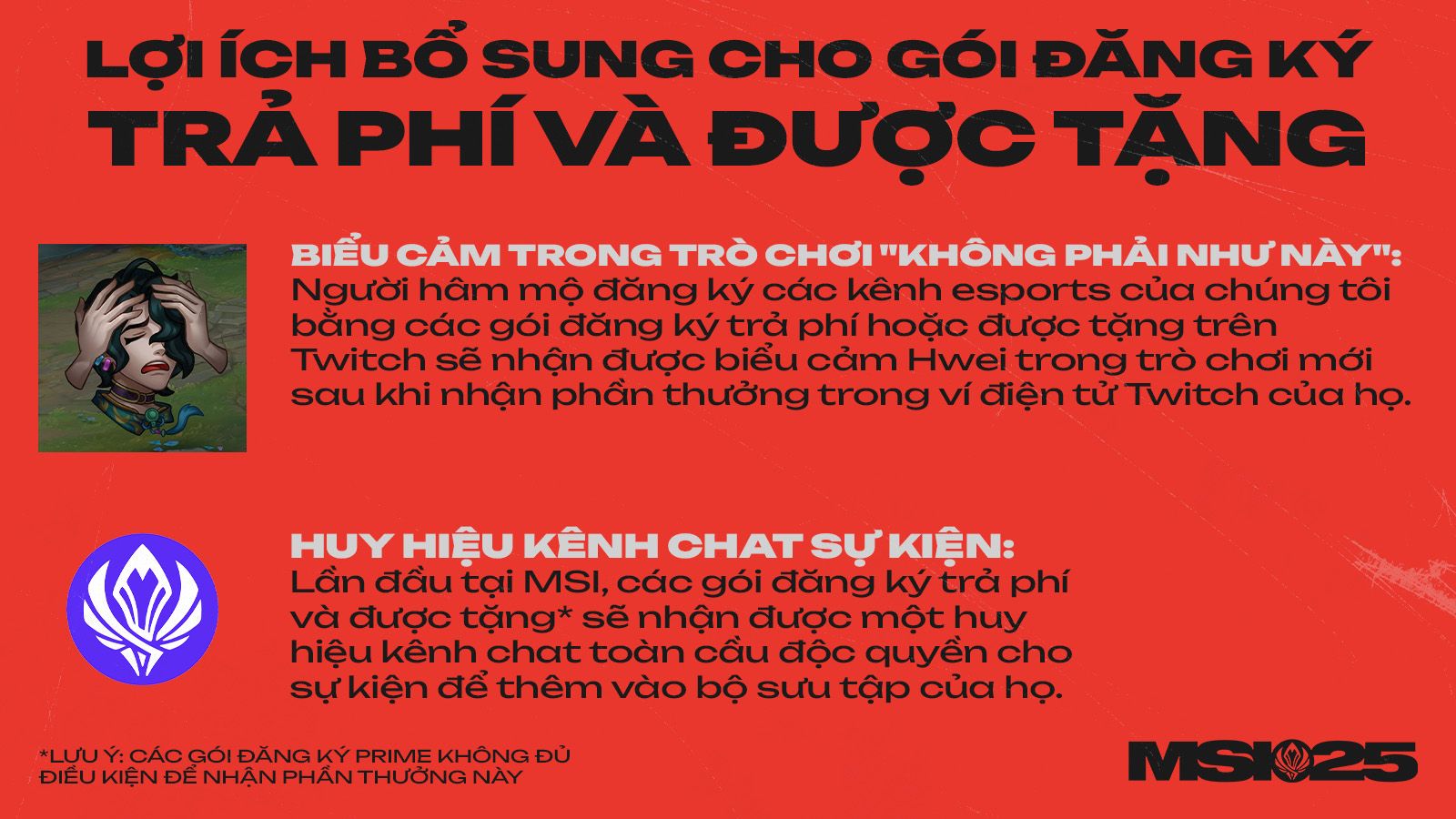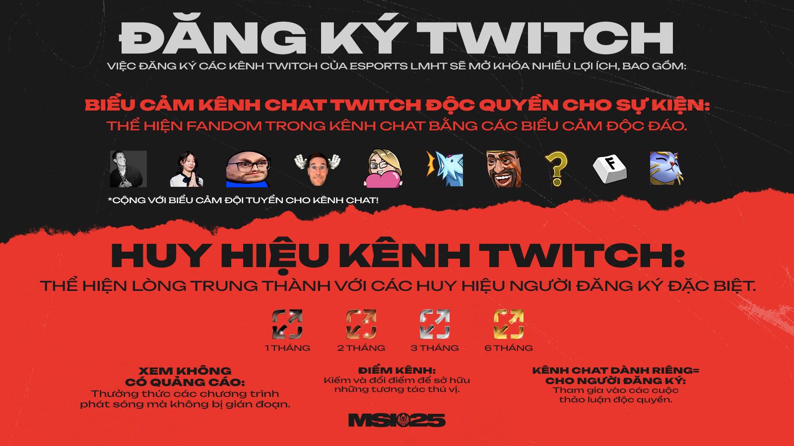 Đăng Ký Twitch đã trở lại với MSI! Tất cả người đăng ký các kênh Esports LMHT trên Twitch đều được hưởng các lợi ích như biểu cảm kênh chat đặc biệt, huy hiệu, xem không có quảng cáo và sự ghi nhận trong các chương trình phát sóng trực tiếp. Xin lưu ý rằng Riot sẽ phân bổ một phần doanh thu kiếm được cho Quỹ Doanh Thu Toàn Cầu để hỗ trợ trực tiếp cho các giải đấu và đội tuyển trong hệ sinh thái Esports LMHT.