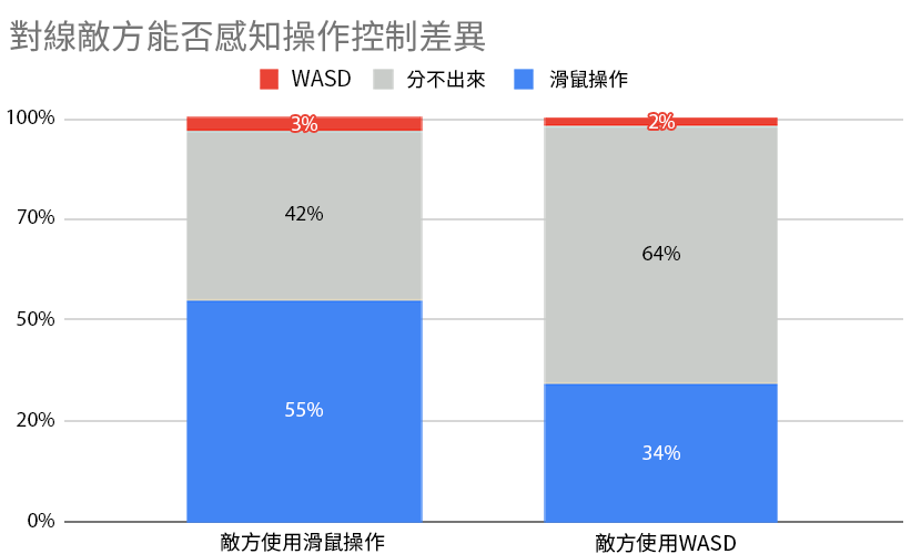 這些問卷調查,是在同時使用了兩種操作模式的對戰結束後,傳送給參與的玩家。在所有啟用了WASD操作的列隊中,我們發現遊戲體驗幾乎不受影響:玩家通常無法察覺對手所使用的操作模式。